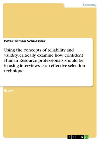 Essay from the year 2002 in the subject Leadership and Human Resources - Miscellaneous, grade: 15 of 20, University of St Andrews (Management Department), course: Human Resource management, language: English, abstract: Using the concepts of reliability and validity, critically examine how confident Human Resource professionals should be in using interviews as an effective selection technique. Interviews are the most common selection technique for recruiting. Notwithstanding, this method has been frequently criticised. It is the task of this essay to evaluate how valid and reliable they are. Therefore, firstly validity and reliability have to be defined to form a basis to start with. Secondly, different types of interviews, beginning with the traditional type, will be presented and analysed. Thirdly, attempts to standardise and improve the interview in terms of reliability and validity will be critically examined. Finally a short outlook will be given, to show that not everything can be related to be reliable and valid. This text will analyse only selection interviews as the topic refers mainly to these. Furthermore it will only deal with personal interviews of employees, which excludes, for example, telephone screening1. Every selection method has weaknesses and therefore it will become clear that interviews are not absolutely valid and reliable, but nevertheless to fill certain vacant positions they will be still irreplaceable. Reliability and Validity are the two key characteristics that interviews have to have to be a suitable method for selection. They measure if the chosen methods provide consistent results and if they adequately measure the characteristic they are looking at2. “Reliability means that the selection methods, tests and ensuing results are consistent and do not vary with time, place or different subjects”3. Or as Cowling puts it: “Reliability is a measure of the consistency with which a predictor continues to predict performance with the same degree of success”4. That means that, for instance, two interviews at a different time and place, with different interviewers and questions but under otherwise same conditions and with the same applicants will bring the same result; namely the best candidate should still be the best and the interviewees who failed should still fail5. It is also possible to maintain the conditions, the applicants and the structure but to change the other parameters of the assessment.