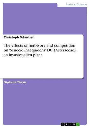 Diploma Thesis from the year 2002 in the subject Biology - Ecology, grade: 1,0 (A), University of Rostock (Institute for Botany), language: English, abstract: Since the end of the 19th century, overall per-capita mobility of humans has increased significantly, leading to increased rates in human-mediated transportation of animal and plant species. The rapid spread of alien organisms, however, may lead to quick and unpredictable changes in ecosystems. Senecio inaequidens DC. (Asteraceae) is an invasive alien plant from South Africa that was first introduced to Europe 100 years ago and is characterized by an exceptionally fast rate of spread; it contains pyrrolizidine alkaloids that are toxic to invertebrates, livestock and humans. In the study presented here, laboratory, greenhouse and field experiments on the biology of Senecio inaequidens were conducted, in order to find out if and how herbivory and plant competition influence growth, survival and reproduction of this plant. Specifically, the presence of vertebrate herbivores, molluscs, insects and plant competitors was experimentally manipulated using full factorial and split-plot designs. All experiments were performed at Imperial College, Silwood Park, about 30 km west of London (UK). Growth and fecundity of Senecio inaequidens were significantly affected by interspecific competition. Vertebrate herbivory only had a significant effect when a closed vegetation cover was present. On artificially disturbed plots, Senecio inaequidens showed high capability to overcompensate for herbivory. Mollusc herbivory significantly reduced fecundity of S. inaequidens. Different ecotypes of Senecio inaequidens showed different amounts of herbivore damage. One of the most remarkable results of this study was that Longitarsus jacobaeae, a native specialist leaf beetle, freely colonized Senecio inaequidens, indicating that native herbivores might be suitable biocontrol agents of invasive alien plants in the future. Host switching from indigenous to invasive alien plant species in oligophagous insect herbivores may be more common than generally thought. The results of this study indicate that Senecio inaequidens is likely to invade and persist in heavily grazed or disturbed grassland ecosystems in the near future; because of the toxic compounds this plant contains, it would be advisable to design a preventive management program and to inform the public about the consequences that might be associated with the invasion of this plant.