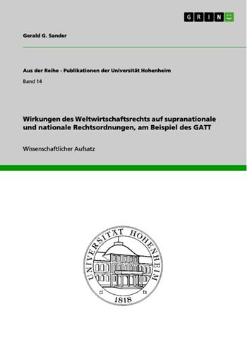 Wissenschaftlicher Aufsatz aus dem Jahr 2003 im Fachbereich Jura - Europarecht, Völkerrecht, Internationales Privatrecht, Universität Hohenheim (Institut für Rechtswissenschaft), Sprache: Deutsch, Abstract: Die Frage nach der Wirkung des Rechts der Welthandelsorganisation (WTO), einschließlich des General Agreement on Tariffs and Trade (GATT), in supranationalen und nationalen Rechtsordnungen hat zentrale Bedeutung für die Effektivität und Durchsetzung der Welthandelsprinzipien. Hinsichtlich der Wirkungsweise internationaler Regeln ist zunächst zwischen folgenden Begriffen zu unterscheiden. Die innerstaatliche Geltung betrifft die Zugehörigkeit völkerrechtlicher Bestimmungen zur nationalen Rechtsordnung. Die Rangfrage klärt, in welchem Verhältnis internationale Normen zu den staatlichen Vorschriften stehen. Schließlich stellt sich die Problematik der unmittelbaren Anwendbarkeit, also inwieweit internationale Regelungen staatliche Behörden und Gerichte binden und sich Bürger vor Gericht auf sie berufen können. Sämtliche Mitgliedstaaten der Welthandelsorganisation sind gem. Art. XVI:4 des Übereinkommens zur Errichtung der WTO (ÜWTO) dazu verpflichtet, ihre Rechtsordnung den wirtschaftsvölkerrechtlichen Bedingungen anzupassen. Im Falle eines Verstoßes stellt sich jedoch die Frage, ob die Einhaltung dieser Verpflichtungen innerstaatlich bzw. im Rahmen einer supranationalen Organisation durchgesetzt werden kann. Von besonderem Interesse ist hier die Untersuchung, inwiefern sich Parteien in einem nationalen oder supranationalen Gerichtsverfahren auf die Bestimmungen des Welthandelsrechts berufen können. Im Folgenden soll am Beispiel des europäischen Gemeinschaftsrechts und überblicksartig an Hand der US-amerikanischen Rechtsordnung diesen Fragestellungen nachgegangen werden.