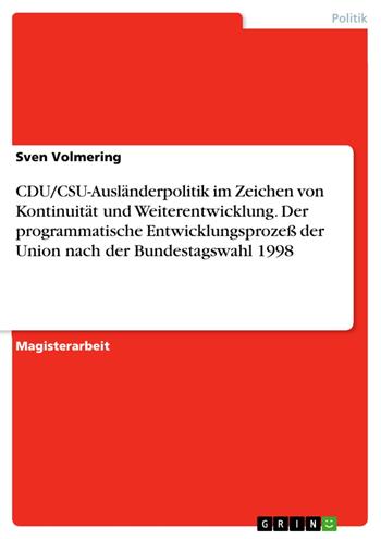 Magisterarbeit aus dem Jahr 2001 im Fachbereich Politik - Politisches System Deutschlands, Note: gut, Universität Münster (Institut für Politikwissenschaft), Sprache: Deutsch, Abstract: Die Niederlage der Unionsparteien CDU und CSU bei der Bundestagswahl am 27. September 1998 markierte ohne Zweifel eine Zäsur von historischer Bedeutung, wurde doch zum ersten Mal in der Geschichte der Bundesrepublik Deutschland eine Bundesregierung durch Wahlen abgelöst.1 Für CDU und CSU, die sich ihrem Selbstverständnis nach als natürliche Mehrheitsparteien in Deutschland ansehen2, bedeutete der Verlust von 6,4 Prozentpunkten und ein Zweitstimmenanteil von 35,1 % mehr als nur das zweitschlechteste Wahlergebnis ihrer Geschichte. Mit dieser schweren Niederlage war nach sechzehnjähriger gemeinsamer Regierungszeit mit der FDP der Beginn der zweiten Oppositionszeit nach 1969 und ein Wechsel an den Führungsspitzen beider Parteien verbunden. Bundeskanzler Helmut Kohl übernahm bereits am Wahlabend die Verantwortung für die Niederlage und kündigte an, nach fünfundzwanzigjähriger Amtszeit auf dem Bundesparteitag der CDU am 07. November 1998 nicht erneut für das Amt des Bundesvorsitzenden zu kandidieren. 3 Obwohl der CDU-Bundesvorstand einen Tag nach der Wahl auf einen Personalvorschlag für den Vorsitz verzichtete, um die Beratungen der Landesverbände nicht zu präjudizieren, war es ein offenes Geheimnis, daß der CDU/CSU-Bundestagsfraktionsvorsitzende Wolfgang Schäuble Nachfolger von Helmut Kohl werden würde.4 Auch der CSU-Vorsitzende, Finanzminister Theo Waigel, teilte dem Parteivorstand mit, daß er sein Parteiamt nach zehn Jahren zugunsten des bayerischen Ministerpräsidenten Edmund Stoiber auf einem außerordentlichen Parteitag zur Verfügung stellen werde. Das CSU-Wahlergebnis von 47,7 % in Bayern sei zwar über jeden Vergleich mit dem Ergebnis der Schwesterpartei erhaben, es habe jedoch den Anspruch der Partei, bei jeder Wahl die Hürde von „50 + x Prozent“ zu überspringen, nicht Stand halten können, so Waigel. 5 Die Deutlichkeit des Ergebnisses vom September 1998 bewahrte CDU und CSU davor, die Wahlniederlage, wie dies 1969 der Fall gewesen war, als „Betriebsunfall“ anzusehen. 6 Dementsprechend überraschte es nicht, daß sowohl jüngere - bspw. die von der Presse als „junge Wilde“ titulierten Roland Koch, Peter Müller und Christian Wulff - als auch etablierte Unionspolitiker wie Heiner Geißler oder Jürgen Rüttgers eine grundlegende Reform von Parteiprogramm und -organisation einforderten. 7 Die neue Parteiführung konnte dies im Hinblick auf zukünftige Wahlen nicht ignorieren. [...]