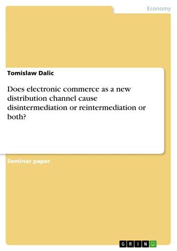 Seminar paper from the year 2001 in the subject Business economics - Offline Marketing and Online Marketing, grade: very good, Maastricht University (Faculty of Economic and Business Administration (FdEWB)), language: English, abstract: “Electronic commerce is an emerging concept that describes the process of buying and selling or exchanging of products, services, and information via computer networks including Internet.”(Turban, Lee, King and Chung, 2000). Electronic commerce, or short e-commerce, promised many benefits and golden opportunities often described by terms like business-tobusiness (B2B) or business-to-consumer (B2C). Those terms are now often used in commercials and advertisements. After only a short while new terminology was invented to describe the new opportunities of e-commerce. The old terms lost their impressiveness much too fast. Venture capital was readily available to finance business models described by peer-to peer (P2P) and consumer-to-business (C2B). The online world but also their financial partners found themselves in the middle of hype. One of the great effects predicted was an effect named disintermediation. This term describes according to Chaffey, Mayer, Johnston and Ellis-Chadwick (2000) the removal of intermediaries. The former linkages between customers and companies like brokers or distributors are replaced by the electronic channel. The picture some dot.com entrepreneurs painted was one of a world without travel agencies, toyshops, electronic retailers and other intermediaries. Disintermediation caused some mid-sized channe l relationship earthquakes after a rebellion from the intermediaries. Resellers of the Apple's I-Mac gave Steve Jobs at a presentation in Paris, Europe a hard stand. Mr. Case was there to inform retailers about Appel's newest PC model. His announcement, that the I-Mac will be exclusively available via the Internet for an introduction period of four weeks, created whistle blowing and tumults among the resellers. The upset intermediaries feared that this four weeks were just a try out for their uncertain future (Stein, 2000). It comes at no surprise that intermediaries rebelled as companies tried to shortcut them with the help of electronic commerce. Another example of disintermediation is Steven King, who tried to sell a new book via the Internet. He put the first chapters online for free and would only write further chapters if most people would pay him. The project called 'The Plant" ended not successfully. Stephen King discontinued his trial because the percentage of paying customers dropped with every chapter (Der Spiegel, 2000). [...]