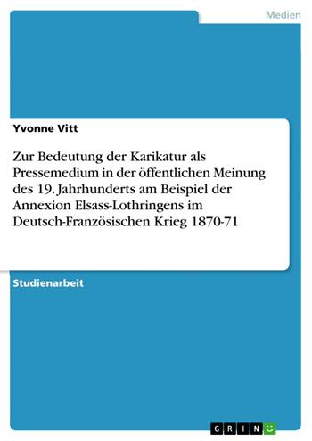 Studienarbeit aus dem Jahr 2002 im Fachbereich Medien / Kommunikation - Medien und Politik, Pol. Kommunikation, Note: 2,0, Universität Siegen (Fach Geschichte), Veranstaltung: Außenpolitik und öffentliche Meinung im 19. Jh., Sprache: Deutsch, Abstract: Der deutsch-französische Krieg endete mit der Kapitulation Paris’ am 28.01.1871, förderte entscheidend die seit 1868 stagnierende deutsche Einigungsbewegung und brachte die Proklamation Wilhelm I. zum Deutschen Kaiser noch während der Belagerung von Paris am 18.01.1871 im deutschen Hauptquartier in Versailles zum Abschluss. Nachdem am 26. Februar 1871 der Vorfriede von Versailles unterzeichnet wurde, folgte am 10. Mai desselben Jahres der Frankfurter Friede, in dem Frankreich sich im Rahmen der Kriegsentschädigungen zu einer Zahlung von 5 Mrd. Francs sowie zu Gebietsabgaben an Deutschland verpflichtete. Nicht zuletzt durch die erzwungene Abtretung der Gebiete Elsass und Lothringen bedingte dieser Krieg ein Zerwürfnis beider Nationen, das von langer Dauer sein sollte. Inwiefern das deutsch-französische Verhältnis durch den Krieg und dessen Ausgang belastet wurde, lässt sich anhand von Ausgaben zeitgenössischer Pressemedien ersehen und durch Beiträge sowohl schriftlicher als auch graphischer Art belegen. Der in Frankreich zu Beginn der Revolution 1789 gebildete Begriff der „opinion publique“, wurde erst nach Ausbruch der Revolution als „öffentliche Meinung“ ins Deutsche übertragen. Einen derart politischen Einfluss wie in England und Frankreich konnte die öffentliche Meinung in Deutschland jedoch nicht gewinnen.1 Im Rahmen der Medienrevolution des 19. und 20. Jahrhunderts, aus welcher der Aufstieg der Massenpresse seit der zweiten Hälfte des 19. Jahrhunderts resultierte2, hatte die Presse einen enormen Einfluss auf die bürgerliche Öffentlichkeit, die sich derzeit noch in ihrer Konsolidierungsphase befand. In ihrer Eigenschaft als Organ der veröffentlichten Meinung entwickelte sich die Presse alsbald zu einer Einfluss- und Kontrollinstanz3, deren Erzeugnisse von der Masse verstärkt rezipiert wurden. In Form der Karikatur war es der Presse möglich eine besonders breite Masse an Rezipienten zu erreichen. Einflussstärke und Wirkungsweise dieser graphischen Darstellung politischer und alltäglicher Sachverhalte sowie deren Vermögen das Nationalbewusstsein zu stärken und den Groll gegen den Feind zu schüren, sollen im Folgenden erklärt werden. 1 vgl. L. Hölscher, S. 1026 2 vgl. A. Schulz, S. 69 u. 82