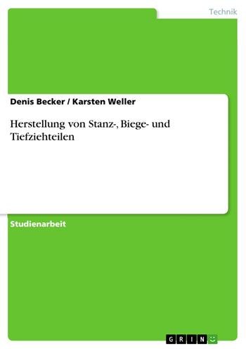 Studienarbeit aus dem Jahr 2003 im Fachbereich Ingenieurwissenschaften - Metallbautechnik und Metallverarbeitung, Note: gut, Fachhochschule Südwestfalen; Abteilung Soest (Institut für Verbundstudien in NRW), Veranstaltung: Seminar Fertigungsverfahren, Sprache: Deutsch, Abstract: Im Verlauf der Industrialisierung in den letzten Jahrzehnten hat die Blechverarbeitung eine gewaltige Veränderung erfahren. War der Werkstoff Blech im Mittelalter, erzeugt und verarbeitet von Schmieden, ein eher grobes Arbeitsmittel, ist es heute als Präzisionswerkstoff nicht mehr wegzudenken. Von der Automobilindustrie mit relativ großen Blechteilen bis hin zur Feinstanztechnik hat das Blech in fast allen Bereichen unseres heutigen Lebens seinen Platz gefunden. Unter Blechverarbeitung versteht man alle Arten der Weiterverarbeitung von gewalztem Metall. Gängige Metalle sind Stahl, Eisen, Kupfer, Aluminium, Messing und sogar Platin oder Gold. Unwichtig ist dabei, ob das Blech in Form einer Platte weiterverarbeitet wird oder vom Coil (Rolle mit aufgewickeltem Blech) kommt, wie es häufig in der Massenproduktion der Fall ist. Um einen kleinen Einblick in die Vielfalt der Blechverarbeitung zu vermitteln, sollen hier einige Anwendungsbeispiele angeführt werden: Tiefziehen : Tee- Eier, Fingerhüte, Schüsseln Biegen : PC Gehäuse, Briefkästen Stanzen (schneiden) : Schlüssel, Lochblech Selbstverständlich sind Mischformen in der Blechverarbeitung die verbreitetste Art. Denkt man an das Beispiel des Teeeis, wird deutlich, dass hier gestanzt und tiefgezogen wird. Ebenso zeigt sich dies in der Automobilindustrie, wo allein bei der Karosserieherstellung geschnitten, gestanzt, tiefgezogen, umgeformt und geschweißt wird. Auch in der Elektro-, Elektronik-, Haushaltswaren- und selbst in der Lebensmittelindustrie wird Blech in immensen Mengen verarbeitet. Aufgrund der Vielschichtigkeit und Komplexität der Blechverarbeitung kann im Folgenden nur auf wenige Bereich detaillierter eingegangen werden. Dem Anspruch auf Vollständigkeit kann eine solche Abhandlung nicht gerecht werden.