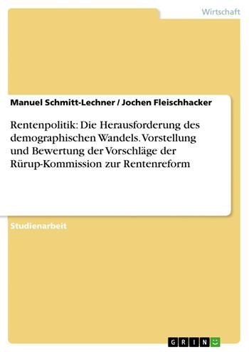 Studienarbeit aus dem Jahr 2003 im Fachbereich BWL - Wirtschaftspolitik, Note: 1,0, Hochschule Pforzheim (Studiengang Personalmanagement), Veranstaltung: Wirtschaftspolitisches Seminar, Sprache: Deutsch, Abstract: In der aktuellen Zeit kann man die Nachrichten über sich ändernde Wirtschaftsdaten in ihrer Fülle kaum noch verfolgen. In guten Wirtschaftslagen überwiegen meist die positiven Nachrichten. In schlechten Wirtschaftslagen wie der jetzigen sind dagegen vermehrt Neuigkeiten z.B. über Aktienkursstürze, Betriebsschließungen oder Kosteneinsparungen zu lesen. Mittlerweile könnte man fast schon behaupten, dass sich die Menschen, auch dank der gewachsenen Popularität von Aktien, an sich wechselnde Wirtschaftszyklen gewöhnt haben. Wenn nicht folgender Effekt auftreten würde, dass gerade in ’Rezessionsphasen’ neben den konjunkturellen verstärkt auch die strukturellen Defizite einer Volkswirtschaft an die Oberfläche kommen. So stehen auch jetzt wieder die Sozialversicherungen in der Diskussion, die im Prinzip einer dringenden Reform bedürfen. Denn, so heißt es unisono, eine Renten-, Kranken- und Pflegeversicherung ist auf einem solch hohen Niveau in der Zukunft nicht mehr finanzierbar. Was es bedeutet, eine auf einer langen Tradition beruhenden Sozialversicherung zukunftsfähig zu gestalten, wollen wir am Beispiel der gesetzlichen Rentenversicherung (GRV) zeigen. Dabei werden wir zunächst einen Überblick über die historischen und aktuellen Entwicklungen des Rentensystems geben. Ferner ist Ziel dieser Arbeit, die dazu verfassten Vorschläge der Rürup-Kommission vorzustellen und einige ausgewählte davon zu diskutieren und zu bewerten.
