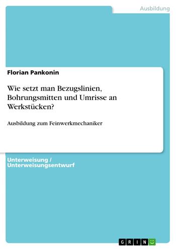 Unterweisung / Unterweisungsentwurf aus dem Jahr 2004 im Fachbereich AdA Handwerk / Produktion / Gewerbe - Mechanische Berufe, Metall und Kunststoff, Note: 1,7, Handwerkskammer für Ostfriesland (HWK Aurich), Sprache: Deutsch, Abstract: Der Unterweisungsentwurf beinhaltet das Thema "Bezugslinien, Bohrungsmitten und Umrisse an Werkstücken". Dabei wird Rücksicht auf Werkstoffeigenschaften und eine nachfolgende Bearbeitung, bestehend aus anreißen und körnen, genommen. Der Auszubildende befindet sich im 1. Ausbildungshalbjahr zum Beruf des/der Feinwerkmechaniker/-in.