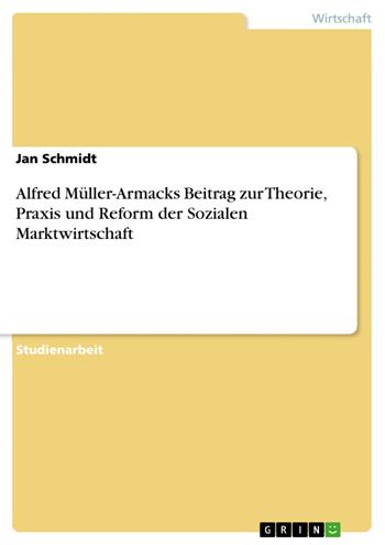 Studienarbeit aus dem Jahr 2003 im Fachbereich VWL - Makroökonomie, allgemein, Note: 1,3, Rheinisch-Westfälische Technische Hochschule Aachen, Veranstaltung: Seminar "Soziale Marktwirtschaft", Sprache: Deutsch, Abstract: Die vorliegende Ausarbeitung beschäftigt sich mit den Beiträgen Alfred Müller-Armacks zur Theorie, Praxis und Reform der Sozialen Marktwirtschaft. Müller-Armack gehörte zu den Begründern und Vordenkern dieser wirtschafts- und gesellschaftspolitischen Konzeption, die seit 55 Jahren die in Deutschland praktizierte Wirtschaftsordnung ist. In dieser Arbeit wird primär versucht die gedanklichen Entwicklungslinien Müller-Armacks nachzuvollziehen und die von ihm ausgemachten Vorteile einer Sozialen Marktwirtschaft wiederzugeben. Neben der theoretischen Idee hinter dem Konzept sind auch Müller-Armacks Voraussetzungen für die Verwirklichung der Sozialen Marktwirtschaft von Interesse, die als Grundlage für die praktische Umsetzung einen besonderen Stellenwert einnehmen. Hierbei kommt der Auswertung der Monographien Müller-Armacks ein besonderer Stellenwert zu, da sich die Arbeit konkret mit den Leistungen und Vorstellungen dieser Person auseinandersetzt und nicht durch gefilterte und subjektive Darstellungen Dritter verwässert werden soll. Diese Punkte (Leitidee, Rechtfertigung, Konzept) beschäftigen sich mit Alfred Müller-Armacks Beitrag zur Theorie der Sozialen Marktwirtschaft. Müller-Armacks Beitrag zur Praxis der Sozialen Marktwirtschaft wird bereits in seinen Forderung zur Umsetzung der Wirtschafts- und Gesellschaftsordnung deutlich. Aber Müller-Armack war nicht nur Theoretiker sondern als Mitarbeiter von Bundeswirtschaftsminister Ludwig Erhard elf Jahre lang tatsächlich für die Praxis mitverantwortlich, weshalb sich diese Arbeit auch mit den realen Folgen und Erfolgen der Sozialen Marktwirtschaft bis zum Ausscheiden Müller-Armacks aus dem Staatsdienst auseinandersetzt. Reformerische Bemühungen Müller-Armacks werden in seiner „zweiten Phase“ der Sozialen Marktwirtschaft deutlich, die seine Auffassung von zu lösenden Zukunftsaufgaben widerspiegelt. Die Arbeit soll die Frage nach den Gründen für die Entstehung der Sozialen Marktwirtschaft und ihren zugrundeliegenden Anforderungen an die Politik und die Menschen aus Sicht Alfred Müller-Armacks beantworten.