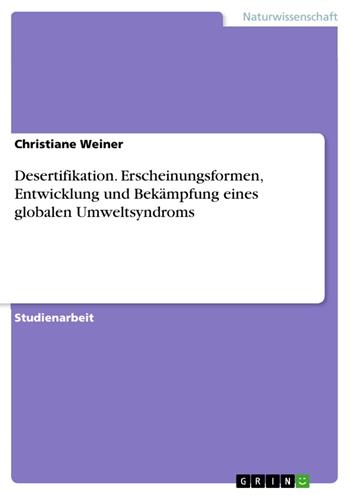 Studienarbeit aus dem Jahr 2004 im Fachbereich Biologie - Ökologie, Note: sehr gut, Universität Bremen (Ökologie), Veranstaltung: Grundwissen Umweltschutz, Sprache: Deutsch, Abstract: Der Begriff „Desertifikation“ kommt aus dem Lateinischen „desertus facere“, was verwüsten bedeutet. Unter Desertifikation versteht man die anthropogen verursachte Ausbreitung wüstenähnlicher Verhältnisse in Gebiete hinein, in denen sie zonal-klimatisch eigentlich nicht existieren. Nach der UNCOD 1977 (United Nations Conference on Desertification) wird Desertifikation folgendermaßen definiert: “Desertification is the impoverishment of arid, semi-arid and some subhumid ecosystems by the impact of man`s activity [..] Desertification is the result of land abuse.” (UN 1977) Nicht durch den Menschen verursachte Ausbreitung wüstenhafter ökologischer Verhältnisse, die vor allem am Zustand des Bodens und der Vegetation sichtbar werden, bezeichnet man als Desertion. Der heute weltweit verwendete Terminus „Desertifikation“ wurde erst durch die oben genannte UN-Konferenz allgemein bekannt. Diese wurde 1977 als Folge einer verheerenden Dürrekatastrophe in der Sahelzone nach Nairobi einberufen. Die von 1969-1974 andauernde Dürre im südlichen Randbereich der Sahara und die in der Folge verstärkt auftretende Ausbreitung wüstenhafter Bedingungen in dieser ursprünglichen Dornsavannenregion war allerdings nur ein Element, das die Initiierung bzw. Beschleunigung des Desertifikations-prozesses steuerte. Andere, und nicht weniger wichtige Auslöser und Steuerfaktoren dieses Geschehens waren Nutzungsfehler der in dieser Region wirtschaftenden Menschen, insbesondere auf dem agrarischen Sektor.