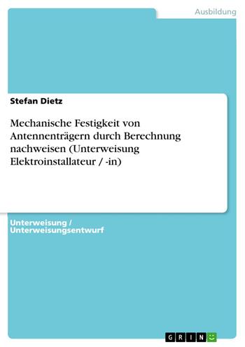 Unterweisung / Unterweisungsentwurf aus dem Jahr 2005 im Fachbereich AdA Handwerk / Produktion / Gewerbe - Elektroberufe, Note: 2, , Sprache: Deutsch, Abstract: Einleitung Ausbildungseinheit: (§ 4 Nr. 16) Installieren, Prüfen, Inbetriebnehmen und Instandhalten von Antennen- und Breitbandkommunikationsanlagen. Lernziel: mechanische Festigkeit des Antennenträgers durch Berechnung nachweisen Lernzielbereiche: Kognitive Lernziele: * Arbeitsschritte verstehen (was, wie, warum) * logische Arbeitsschritte begreifen Psychomotorische Lernziele: Vermessung von Anbaukomponenten einer Antennenanlage Affektive Lernziele: * Motivation zur Genauigkeit und Sorgfalt * Haltung und Einstellung bezüglich der Bedeutung einer genauen Berechnung verändern. Zielgruppe: 3. / 4. Lehrjahr 1 Auszubildender Methoden: Vier – Stufen – Methode * 1. Stufe: Vorbereiten des AZUBI * 2. Stufe: Vormachen / Erklären durch den Ausbilder * 3. Stufe: Nachmachen / Erklären lassen * 4. Stufe: Selbstständiges Anwenden und Üben des Gelernten Weiterhin wird nach folgenden Prinzipien unterwiesen: * Zielklarheit * Fasslichkeit Medien: Werkzeuge und Material: * Messwerkzeug (Zollstock, ...) * ggf. Standrohr/Parabolantenne etc. * Taschenrechner * Zeichenmaterial Rahmenbedingungen: In der Werkstatt oder dem Büro an einem aufgeräumten Platz. In der Zeit von 07:00 und 10:00 Uhr Führungsstil: kooperativer Führungsstil Lernzielkontrolle: In meinem Beisein wird der AZUBI selbstständig arbeiten. Durch Hinterfragen seiner Tätigkeit stelle ich fest, ob er den Lernstoff aufgenommen und verstanden hat. Unfallverhütung: Die Unfallverhütungsvorschriften sind dem Auszubildenden durch regelmäßige Teilnahme an der betrieblichen Unfallschutzbelehrung nahe zu bringen.
