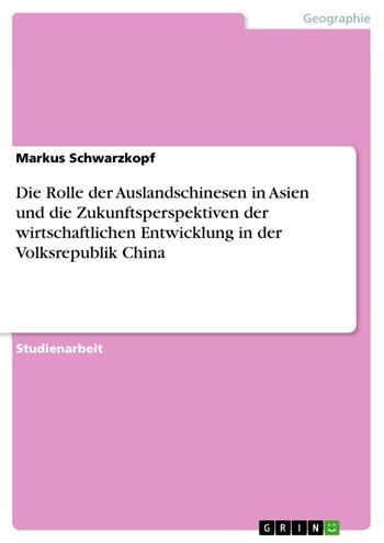 Studienarbeit aus dem Jahr 2005 im Fachbereich Geowissenschaften / Geographie - Wirtschaftsgeographie, Note: 1,0, Hochschule München (Fachbereich Wirtschaftsingenieurwesen), Veranstaltung: Internationale Wirtschaftsräume (Seminar), Sprache: Deutsch, Abstract: „The world’s fastest growing economy? China. The market you can’t afford not to be in? China. The source of the funds to keep the U.S. economy from going bust? China. The engine behind global trade growth? China. The unfair trader manipulating the value of its currency at the expense of Europe and the United States? China. The giant Gorilla siphoning off jobs from the West? China. The indifferent employer pushing labor standards lower throughout the developing world? China.” (Pfanner, 2004) Mit diesen Fragen eröffnete Eric Pfanner, Journalist des Herald Tribune, seinen Bericht über das Weltwirtschaftsforum 2004 in Davos, auf dem neben Terrorismus und Sicherheitsfragen China das wichtigste Thema war. In der Tat ist die wirtschaftliche Entwicklung Chinas rasant. Mit den Reformen unter Deng Xiaoping im Jahre 1978 öffnete sich China dem Westen und zieht seitdem internationale Konzerne sowie Investitionskapital an. Ein durchschnittliches Wachstum des Bruttoinlandsprodukts seit 1978 von jährlich 9%, ein Anstieg des Außenhandelsvolumens im gleichen Zeitraum von 15% p.a. und Direktinvestitionen aus dem Ausland in Höhe von 53,2 Milliarden Dollar im Jahre 2002 drücken den Aufstieg der chinesischen Wirtschaft in Zahlen aus (vgl. Lieberthal, 2004). Umso erstaunlicher ist es, dass noch vor 30 Jahren das heutige Boomland China von kommunistischer Misswirtschaft, Hunger und Armut in der Bevölkerung geprägt war. Die vorliegende Arbeit beleuchtet in erster Linie die Bedeutung der so genannten Auslandschinesen in Asien sowie ihre Rolle am wirtschaftlichen Aufschwung Chinas. Ferner werden die allgemeinen Chancen und Risiken für die künftige Weiterentwicklung der Volksrepublik China betrachtet.