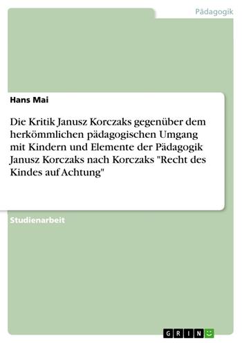 Studienarbeit aus dem Jahr 2003 im Fachbereich Pädagogik - Reformpädagogik, Note: gut, Pädagogische Hochschule Karlsruhe, Sprache: Deutsch, Abstract: A. Kritik Korczaks gegenüber dem herkömmlichen pädagogischen Umgang mit Kindern 1. Missachtung des Kindes; Misstrauen gegenüber dem Kind 2. Unwillen, die Eigenheiten der Kinder hinzunehmen 3. Das Recht auf Achtung 4. Das Recht des Kindes, zu sein, was es ist B. Elemente der Pädagogik Janusz Korczaks 1. Mit den Kindern fühlen 2. Die Kinder begleiten 3. Aus eigenen Fehlern lernen 4. Die Rechte der Kinder achten C. Schlussbetrachtung D. Literaturangaben