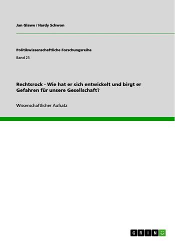 Wissenschaftlicher Aufsatz aus dem Jahr 2004 im Fachbereich Politik - Sonstige Themen, Note: gut, Hochschule Neubrandenburg (University of applied science), Sprache: Deutsch, Abstract: „Rechtsrock“ haben wir als Thema unserer Hausarbeit gewählt, um ein besseres Verständnis über Ursachen und Auswirkungen von rechter Musik auf Politik und Gesellschaft zu erlangen. Rechtsrock spielt eine größere Rolle für die Politik als man üblicherweise annimmt. Jugendliche suchen und entwickeln kontinuierlich soziokulturelle Orientierungsmuster, um sich zu identifizieren, sich zugehörig zu fühlen oder sich abzugrenzen. Dazu wird heute das Medium Musik verstärkt genutzt. Derzeit existieren etwa 60 bis 80 „Rechtsrock“-Bands, die durch legale Veröffentlichungen an die Öffentlichkeit getreten sind. Die Dunkelziffer bei halblegalen und illegalen Veröffentlichungen liegt bei weitem höher. Wir beschreiben die geschichtliche Entstehung des Rechts- Begriffs. Was bedeutete der Begriff, und wie wird er heutzutage von unserer Gesellschaft verstanden? Die Schwierigkeit der Definition von Rechtsextremismus liegt in der Abgrenzung von Nationalismus, Nationalsozialismus und Sozialdarwinismus. Deshalb beleuchten wir den Begriff unter dem Gesichtspunkt der „freiheitlich-demokratischen Grundordnung“. Die rassistische Gewaltexplosion in Deutschland, Anfang der 90er Jahre, gab Anlass für Medien, Politik und Jugendschutz sich mit diesem Thema auseinanderzusetzen. Da man den „Rechtsrock“ nicht als geplantes und kommerzielles Produkt der Musiklandschaft begreifen darf, muss seine geschichtliche Entwicklung betrachtet werden. Um ein Verständnis für die gesellschaftliche Entwicklung von Rechtsrock zu erhalten, ist es notwendig in die Jugend- und Musikszene der späten 50er Jahre zurückzugehen. Es werden im Besonderen die Wurzeln der Musik beschrieben und diejenigen, die sich mit ihr identifizieren. Durch den ständigen Konflikt mit dem geltenden Recht in Deutschland, ist es notwendig über mögliche Gefahren nachzudenken. Wir rücken zwei Gefahren in den Vordergrund unserer Betrachtung. Zum einen die Verherrlichung von Gewalt, und die Bereitschaft diese auszuüben, zum anderen die Verbreitung von rechtsextremem Gedankengut unter weiten Teilen der Bevölkerung, besonders unter den Jugendlichen.