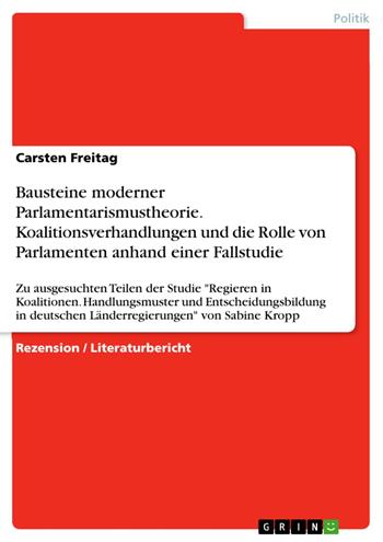 Rezension / Literaturbericht aus dem Jahr 2003 im Fachbereich Politik - Politisches System Deutschlands, Note: 1,0, Helmut-Schmidt-Universität - Universität der Bundeswehr Hamburg (Institut für Politikwissenschaft), Sprache: Deutsch, Abstract: Wie steht es um die verfassungsmäßig einzig wirklich demokratisch legitimierten Institutionen in Deutschland? Welche Position übernehmen die Parlamente im politischen Orchester Deutschlands heutzutage? Dieser Literaturbericht will sich der Frage weniger von der theoretischen Seite als vielmehr von der Seite der praktischen Politik aus nähern. Dies geschieht anhand der Betrachtung einer Fallstudie zum Thema Koalitionen auf Landesebene. Die Arbeit beschäftigt sich mit ausgesuchten Teilen der Studie „Regieren in Koalitionen. Handlungsmuster und Entscheidungsbildung in deutschen Länderregierungen“ von Sabine Kropp. Im Mittelpunkt des Interesses stehen die Koalitionsverhandlungen. Diese Studie von verschiedenen Koalitionsverhandlungen und deren übergreifenden Gemeinsamkeiten bietet Möglichkeiten, aus der Realität heraus, Antworten auf die Frage nach der Relevanz von Länderparlamenten zu finden. Aus Struktur und Ablauf der Koalitionsverhandlungen sowie aus den Handlungen der beteiligten Koalitionspartner sollen Rückschlüsse auf die reale Position der Parlamente im Politikprozess gezogen werden. Die übergeordnete Fragestellung der Arbeit ist demnach, welches Verständnis von der Rolle von Parlamenten sich aus der Betrachtung von Koalitionsverhandlungen gewinnen lässt. Von Interesse sind daher hauptsächlich die Aussagen zur Rolle des Parlamentes. Die Arbeit ist daher selektiv und es werden größere Teile der Studie ausgeklammert. Im ersten Teil werden die Ziele der Studie aufgezeigt und der Aufbau sowie die theoretischen Grundlagen zusammengefasst. Der zweite Abschnitt befasst sich dann mit den konkreten Erkenntnissen der Fallstudie. Hier steht die Beschreibung der Koalitionsverhandlungen im Vordergrund. Die Koalitionsverhandlungen sind daher von besonderem Interesse, da sie das Bindeglied zwischen der Wahl und der späteren parlamentarischen Arbeit darstellen und ein großer Teil der Politik bereits hier festgelegt wird. Die Rolle und das Verständnis von Parlamentarismus soll dann im dritten Teil anhand der Betrachtung der Fallbeispiele herausgearbeitet werden. In der Schlussbetrachtung werden die Ergebnisse zusammengefasst und eine abschließende Bewertung vorgenommen.