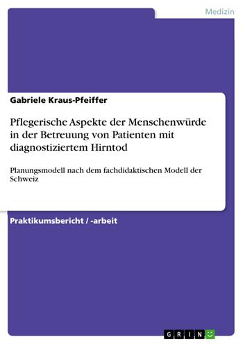 Praktikumsbericht / -arbeit aus dem Jahr 2005 im Fachbereich Pflegewissenschaft - Sonstiges, Note: 1,5, , Veranstaltung: Lehrprobe, Sprache: Deutsch, Abstract: Das dritte Praktikum vom 05.04.2005 bis 02.05.2005 absolviere ich in der Fachweiterbildung des Pflegepersonals in Intensivpflege und Anästhesie am Klinikum der Universität München - Großhadern. Ich werde 2 x 90 Minuten Unterricht im Kurs I und Kurs II nach dem Fachdidaktischen Modell der Schweiz zu dem Thema: "Pflegerische Aspekte der Menschenwürde in der Betreuung von Patienten mit diagnostiziertem Hirntod" gestalten. Dieses Fachdidaktikmodell wurde in der Schweizer Kaderschule für Krankenpflege des Schweizer Roten Kreuzes in Aarau entwickelt. Die Lehrprobe findet am 02.05.2005 von 14:45 - 16:15 Uhr im Kurs I statt. Prüferin ist Frau K., Lehrgangsleitung des Lehrgangs "Leitung und Unterricht" am Berufsfortbildungswerk München. Meine Praktikumsbetreuerin ist Frau K.S. bei der ich mich auf diesem Wege ganz herzlich bedanken möchte. 1. Allgemeindidaktische Überlegungen 1.1 Bedingungsanalyse: Schultyp: Fachweiterbildung des Pflegepersonals in Intensivpflege und Anästhesie am Klinikum der Universität München-Großhadern.