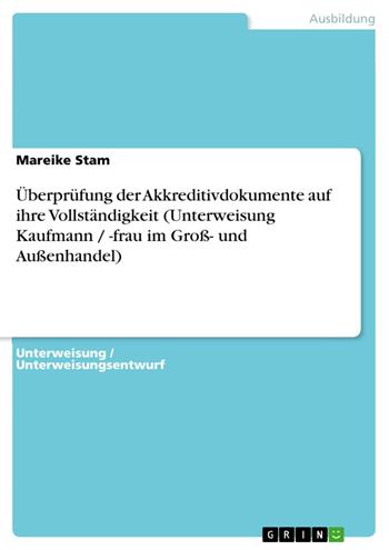 Unterweisung / Unterweisungsentwurf aus dem Jahr 2004 im Fachbereich AdA Kaufmännische Berufe / Verwaltung, Note: sehr gut, , Veranstaltung: Ada-Prüfung , Sprache: Deutsch, Abstract: In unserem Unternehmen gliedert sich die Finanzabteilung in unterschiedliche Bereiche. Ich bin im Bereich des Inventory Controlling angestellt, der sich größtenteils mit den Warenlieferungen unserer ausländischen Lieferanten beschäftigt. Jeder Sachbearbeiter ist für die komplette Zahlungsabwicklung und Überprüfung der ihm zugewiesenen Lieferländer zuständig. Die Hinarbeitung auf eine reibungslose Zahlungsabwicklung nimmt im täglichen Arbeitsablauf einen besonderen Stellenwert ein, denn gerade im ausländischen Zahlungsverkehr gibt es unterschiedlichste Möglichkeiten und Bedingungen, die beachtet werden müssen. Da das Unternehmen E. den Großteil seiner Waren nicht aus dem europäischen Ausland, sondern aus Fernost bezieht, ist eine der wichtigsten Zahlungsmöglichkeiten das Dokumenten-Akkreditiv. Zwar wird die Abwicklung von Akkreditiven hauptsächlich von den Banken erledigt, jedoch benötigt der einzelne Sachbearbeiter weiterhin das theoretische Hintergrundwissen einer Akkreditivabwicklung, da alle Dokumente vom Sachbearbeiter auf Ihre Vollständigkeit hin geprüft werden müssen bevor eine endgültige Zahlung seitens der Bank vorgenommen werden kann. Das Thema dieser Ausbildungseinheit entnehme ich dem Ausbildungsrahmenplan der Ausbildungsordnung für die Kauffrau im Groß- und Außenhandel vom 13.05.1997, Abschnitt I.: Gemeinsame Fertigkeiten und Kenntnisse, § 3 Abs. 1 Nr. 6.3. Buchstabe a (siehe Anlage). Der Ausbildungseinheit vorausgegangen ist eine Präsentation zu folgenden Themen : Welche besonderen Zahlungsmöglichkeiten gibt es im Außenhandelsgeschäft ? Was ist ein Akkreditiv ? Was muß ein Akkreditiv beinhalten ? Welche Vorteile ergeben sich für Verkäufer und Käufer durch die Zahlungsabwicklung per Akkreditv ? Wie wird ein Akkreditiv eröffnet ? Welche Dokumente sind nötig bzw. zu beachten ?