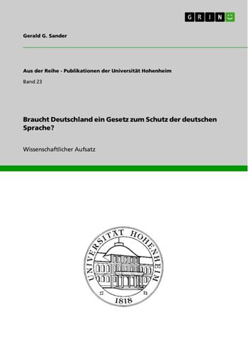 Wissenschaftlicher Aufsatz aus dem Jahr 2006 im Fachbereich Jura - Andere Rechtssysteme, Rechtsvergleichung, Universität Hohenheim (Institut für Rechtswissenschaft), Sprache: Deutsch, Abstract: Angesichts der zunehmenden Unterwanderung der deutschen Sprache mit Anglizismen formiert sich in Teilen der Bevölkerung immer stärker der Widerstand gegen diese scheinbar unaufhaltsame Entwicklung. Nirgends lässt sich wohl besser als in Deutschland der Statussymbol-Charakter des Englischen in Wissenschaft, Ökonomie, Politik und im Alltag der Gesellschaft beobachten. Die Sprecher wollen sich weltgewandt, gebildet und modern geben; oftmals steckt jedoch nur schlichte Angeberei dahinter. Anglizismen und Amerikanismen wie Team, Couch, Game, Roadmap, Service, Competition, Public Relations, Redesign, Download, Knowledge, Level, Event, Meeting, Background, Backstage etc. bereichern in rasant steigender Zahl die deutsche Sprache. Allein das englische Wort Ticket ersetzt heutzutage u. a. die Eintrittskarte, den Fahrschein, den Parkschein, die Opernkarte und den Strafzettel. „Mischmasch“-Wortschöpfungen wie Themen-Specials, Antriebspower, Hands-on-Mentalität, Telefon-Kampaigning, Themen-Setting, Stand-up-Kabarett und das Care-Telefon der AOK beherrschen immer mehr unser tägliches Leben. Insbesondere von älteren Personen werden diese Begriffe häufig gar nicht mehr verstanden. Auffallend ist auch der inflationäre, zum Teil aus dem Englischen übernommene Gebrauch des „Apostroph-S“. Das im Volksmund auch „Deppenapostroph“ genannte Zeichen findet mittlerweile sowohl Anwendung bei der eigentlich fugenlosen Anhängung eines Artikels als auch bei der Abtrennung des Genitiv-S und inzwischen sogar - als Scheinanglizismus - bei der Pluralbildung5. In Nachahmung von „McDonald’s“ kommt heute kaum noch ein deutsches Gewerbe ohne die Verwendung des apostrophierten S aus, wenn es um die Namenswahl geht (z. B. „Erika’s Hafenkneipe“).