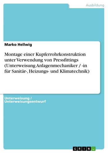 Unterweisung / Unterweisungsentwurf aus dem Jahr 2006 im Fachbereich AdA Handwerk / Produktion / Gewerbe - Installateur, Note: gut ( 2), , Sprache: Deutsch, Abstract: Das Thema der Unterweisung bezieht sich auf die Fertigung von Rohrinstallationen. Der Lehrling soll in diesem Zusammenhang eine neue Verfahrenstechnik kennen lernen. Er soll den Umgang mit der bei dem angewandten Pressverfahren zum Einsatz kommenden Maschine kennen lernen. Der Lehrling kann nach der Unterweisung fachgerecht und ordnungsgemäß unter Beachtung der UVV und unter Zuhilfenahme von Gliedermaßstab, Bleistift, Rohrabschneider, Rohrentgrater und Rohrpressmaschine (Hersteller „Viega“) einen Rohrinstallationsausschnitt in Form einer Etage von 30 Zentimeter, bestehend aus zwei Bogen 90° und einem Rohrstück mit zu berechnender Länge (Z-Maß-Methode), anfertigen, auf Maßhaltigkeit überprüfen und sein Vorgehen erläutern.