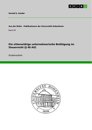Studienarbeit aus dem Jahr 1990 im Fachbereich Jura - Steuerrecht, Note: 16 von 18 Punkten, Eberhard-Karls-Universität Tübingen (Juristische Fakultät), Veranstaltung: Grundprobleme des Unternehmenssteuerrechts, Sprache: Deutsch, Abstract: Die Ausgangsfrage der vorliegenden Untersuchung lautet, ob ein sittenwidriges Geschäft eines Unternehmers besteuert werden darf, und wenn man dieses bejaht, ob Aufwendungen, die dafür getätigt wurden, abzugsfähig und Vergünstigungen zu gewähren sind. Aufschlußreich für die Beantwortung der Fragestellung ist die historische Entwicklung der Rechtsprechung und der Literatur zu einer Zeit, in der man noch auf keine gesetzliche Regelung zurückgreifen konnte, bis hin zur Normierung des § 5 II StAnpG und des § 40 in der Abgabenordnung von 1977. Es sind auch die Tatbestandsmerkmale des § 40 AO zu untersuchen, wobei zu klären ist, ob ein strafbares oder sittenwidriges Verhalten überhaupt eine unternehmerische Betätigung im engeren Sinne sein kann. Sind zum Beispiel die Einkünfte einer Prostituierten sonstige Einkünfte oder solche aus Gewerbebetrieb? Desweiteren ist zu fragen, ob auch die Abzugstatbestände und Steuervergünstigungen der Anwendung der Vorschrift unterfallen. Falls eine Anwendbarkeit angenommen wird, ist zu prüfen, inwieweit eine Einschränkung, durch eine restriktive Auslegung der Vorschriften über die Steuerbefreiungen und -abzüge, wegen einer Verletzung der Einheit der Rechtsordnung geboten ist. Stellt man auf einen Gesetzespositivismus ab, so wird man den § 40 AO zweifelsfrei als rechtsverbindlich und durch die Finanzverwaltung und -gerichte als anwendbar bezeichnen müssen. Trotzdem bleibt zu prüfen, inwieweit es überpositves Recht gibt, das eventuell die Vorschrift des § 40 AO zurückdrängt. Gedacht werden kann hier an eine ethische Betrachtungsweise, die fragt, ob § 40 AO den Anforderungen an Gerechtigkeit und Sittlichkeit und an die "Einheit der Rechtsordnung" genügt.