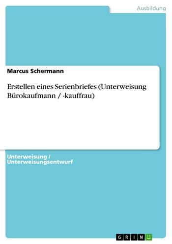 Unterweisung / Unterweisungsentwurf aus dem Jahr 2009 im Fachbereich AdA Kaufmännische Berufe / Verwaltung, Note: 2, , Veranstaltung: IHK Prüfung, Sprache: Deutsch, Abstract: Die in diesem Präsentationskonzept beschriebene Ausbildungseinheit bildet eine Grundlagenabhandlung für Ausbilder in dem Ausbildungsberuf der Bürokaufleute, explizit für das Erstellen eines Serienbriefes. Vorüberlegungen, Planung, sowie Durchführung und Nachbereitung der Ausbildungseinheit bilden hier für den Ausbilder Schritt für Schritt, unter Berücksichtigung der arbeitspädagogischen Methoden, eine Grundlage für die innerbetriebliche Auszubildenenunterweisung.
