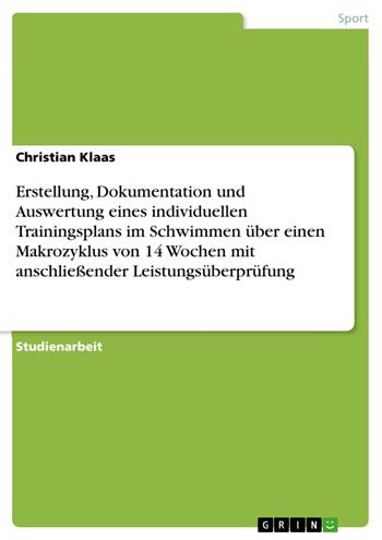 Studienarbeit aus dem Jahr 2005 im Fachbereich Sport - Theorie und Praxis der Sportarten, Note: 2,0, Technische Universität Darmstadt (Institut für Sportwissenschaft), Sprache: Deutsch, Abstract: Das erfolgreiche Absolvieren des Aufbaukurses Training in der Sportart Schwimmen an der TU-Darmstadt erfordert von den Studenten am Ende des Semesters eine Leistungsüberprüfung (100m auf Zeit) in zwei beliebigen Schwimmarten aus Kraul, Rücken, Brust und Delphin. Um sich auf diese Leistungsüberprüfung vorzubereiten trainieren die Sportstudenten 1-2 Mal die Woche unter Anleitung der Dozentin und ansonsten frei nach ihrem eigenen Ermessen je nach Anspruch, Zeitressourcen und Leistungsniveau. Es besteht jedoch die Vorgabe unabhängig von den individuellen Zielvorstellungen einen Trainingsplan für den gesamten Makrozyklus aufzustellen, also vorab zu planen, wie viel man was, wann und wie trainieren will. Im Verlauf dieser 14 Wochen dokumentieren die Studenten dann, was sie tatsächlich trainiert haben und werten nach der erfolgten Leistungsüberprüfung das Training mit Blick auf die erzielte Leistung aus. Die vorliegende Arbeit stellt den Trainingsplan, das tatsächliche Training und deren Auswertung für den Studenten Christian Klaas dar.
