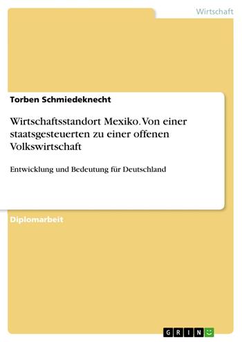 Diplomarbeit aus dem Jahr 2006 im Fachbereich VWL - Internationale Wirtschaftsbeziehungen, Note: 2,3, International School of Management, Standort Dortmund (Internationale Betriebswirtschaftslehre), Sprache: Deutsch, Abstract: Diese Arbeit befasst sich mit der Entwicklung und den Folgen des Wandels der mexikanischen Wirtschaft von einer staatsgesteuerten zu einer der offensten Ökonomien der Welt. Wie anhand der Arbeit deutlich werden soll, ist es durch den Kurswechsel und die Finanzkrise der 90er Jahre in der Wirtschaftsstruktur und in der Bevölkerung zu tief greifenden Veränderungen gekommen. Neben der Bewertung des Kurswechsels wird die aktuelle Krisenanfälligkeit eingeschätzt und das Wachstumspotential Mexikos untersucht. Die Verbindung zwischen Deutschland und Mexiko wird hinsichtlich der Frage analysiert, inwiefern kulturelle Unterschiede das Geschäftsverhalten beeinflussen und welche Maßnahmen die geschäftlichen Beziehungen verbessern könnten. Die Arbeit soll dem Leser einen Überblick über die Wirtschaftsentwicklung und kulturellen Hintergründe des Standortes Mexiko geben. Unter diesen Gesichtspunkten könnte sie deutschen Unternehmen als mögliche Grundlage für Investitionsentscheidungen dienen. Um den Rahmen der Arbeit nicht zu sprengen, läßt die Arbeit die steuerlichen, rechtlichen und politischen Gesichtspunkte weitestgehend unberücksichtigt.