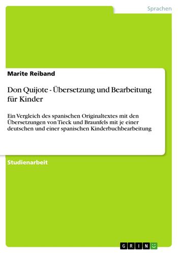 Studienarbeit aus dem Jahr 2005 im Fachbereich Sprachwissenschaft / Sprachforschung (fachübergreifend), Note: 2,3, Ruprecht-Karls-Universität Heidelberg, Veranstaltung: Die literarische Übersetzung, Sprache: Deutsch, Abstract: In diesem Jahr jährt sich das Erscheinen des 1. Teils des Don Quijote de la Mancha zum 400. Mal. 1615 erschien der zweite Teil vom „Scharfsinnigen Edlen von la Mancha“ des Spaniers Miguel de Cervantes Saavedra. Sein weltbekanntes Werk wurde in viele Sprachen übersetzt, die jüngste Übersetzung stammt aus dem Jahre 1976 ins Baskische. Weiterhin hat der deutsche Buchmaler Reinhold Metz 1977 eine handgeschriebene Ausgabe veröffentlicht. Die beiden bekanntesten Übersetzungen ins Deutsche liefern wohl Ludwig Tieck (1799-1801 erschienen) und Ludwig Braunfels (aus dem Jahr 1848). Sowohl im Spanischen als auch im Deutschen wurde der Don Quijote für ein bestimmtes Publikum bearbeitet, darunter auch für Kinder. Es handelt sich hierbei um eine vereinfachte und gekürzte Abfassung des Originals. Ziel meiner Arbeit ist einerseits, die Unterschiede zwischen einer Übersetzung und einer Bearbeitung aufzuzeigen und andererseits, den spanischen Originaltext des Don Quijote mit den beiden deutschen Übersetzungen von Ludwig Tieck und Ludwig Braunfels und mit je einer deutschen und einer spanischen Kinderbuchbearbeitung zu vergleichen, außerdem auf subjektive Art und Weise ausgewählte Textpassagen aufzuzeigen, zu kritisieren und zu beurteilen.