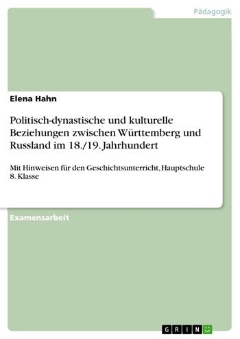 Examensarbeit aus dem Jahr 2007 im Fachbereich Didaktik - Geschichte, Note: 1,5, Pädagogische Hochschule Ludwigsburg, Sprache: Deutsch, Abstract: Deutsche in Russland – Russen in Deutschland, die Geschichte zweier Völker, die über Jahrhunderte hinweg weit in soziale, kulturelle und wirtschaftliche Bereiche hineinreicht, die Phasen der Annäherung und des engen gesellschaftlichen Austausches durchlief sowie gewaltige Auseinandersetzungen und Widersprüche auf der politischen Ebene bis zum schlimmsten Leid der Bevölkerung beiderseits mit sich brachte. Diese Geschichte ist sicherlich nicht einfach. Vor allem das 20. Jahrhundert hinterließ deutliche Spuren gegenseitigen Misstrauens, Unverständnisses und Abneigung zwischen Russland und Deutschland. Wenn wir aber weiter zurück in die Geschichte blicken, entdecken wir die Zeiträume, in denen es durchaus deutsch-russische Beziehungen gab, freundliche, vielversprechende, hilfreiche – Verbindungen zum Vorteil beider Seiten, die den Horizont beider erweiterten, ungeahnte Möglichkeiten eröffneten und auch viele enge persönliche Kontakte schufen. ”An diesem gegenseitigen Geben und Nehmen hatten alle deutschen Gebiete teil, aber es lässt sich in besonderer Weise für den deutschen Südwesten, vor allem für Württemberg, aufzeigen”.