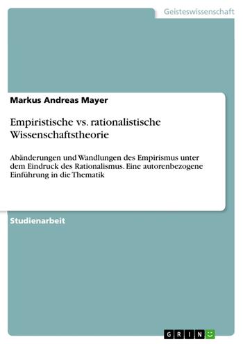 Studienarbeit aus dem Jahr 2004 im Fachbereich Philosophie - Epochenübergreifende Abhandlungen, Note: Angenommen (ohne Benotung), FernUniversität Hagen (Institut für Philosophie), Sprache: Deutsch, Abstract: Diese Arbeit macht es sich zur Aufgabe die empiristische Wissenschaftstheorie mit einem rationalistischen Wissenschaftsverständnis zu vergleichen und unter dem Eindruck dieses Vergleichs die Abänderungen und Wandlungen des Empirismus zu identifizieren. Dies geschieht jeweils in kurzen Abrissen und autorenbezogen. Aufgrund der Komplexität und Stofffülle wird jeweils nur ein Überblick gegeben, der den Leser mit einem Grundlagenwissen versorgen soll. Die Untersuchung wird in Gliederungspunkt zwei die Begriffe empirisch/empiristisch und rational/rationalistisch von einander abgrenzen, um in Punkt drei die dazugehörigen Verständnisse von Wissenschaft zu vergleichen. Danach wird anhand von Beispielen (Autoren) gezeigt, wie sich die empiristischen Auffassungen im Laufe der Zeit geändert haben und welchen Einfluß Philosophen mit rationalistischem Wissenschaftsverständnis darauf hatten (Ziffer 4). Eine Zusammenfassung mit einer Bewertung durch den Verfasser runden die Untersuchung ab (Ziffer 5).