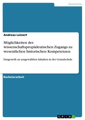 Bachelorarbeit aus dem Jahr 2007 im Fachbereich Didaktik - Geschichte, Note: 1,3, Universität Potsdam (Historisches Institut), Sprache: Deutsch, Abstract: Die vorliegende Bachelorarbeit handelt von den Möglichkeiten des wissenschaftspropädeutischen Zugangs zu wesentlichen historischen Kompetenzen, die an ausgewählten Inhalten der Grundschule dargestellt werden. Konkret geht es hier also um die Förderung der so allgemein klingenden, aber doch unheimlich komplexen Anforderung des „historischen Lernens“ zum Aufbau eines Geschichtsbewusstseins. Gerade in der Grundschule besteht die große Chance, dieses historische Denken zu fördern, und zwar mit bestimmten historischen Methoden und Arbeitshilfen. Mit dieser Arbeit werden also die verschiedenen Möglichkeiten der Wissenschaftspropädeutik dargestellt und auf ihre Realisierbarkeit in der Primarstufe konkretisiert. Natürlich gibt es abseits dieser Ausarbeitung noch andere grundschulgeeignete Methoden zur Erlernung historischer Kompetenzen, wie etwa das Archiv, Karten, Filme und noch einige mehr. Aus Kapazitätsgründen werden diese jedoch hier außen vor gelassen. Folgende erkenntnisleitende Fragestellungen sollen bei dieser Arbeit geklärt werden: Welche Bedeutung hat historisches Lernen in der Grundschule? Können Schüler diese Fähigkeit überhaupt schon erbringen? Was sagen die Rahmenlehrpläne für den Sachunterricht und Geschichte dazu? Welche wissenschaftspropädeutischen Methoden können in der Grundschule eine Rolle spielen und worauf muss dabei jeweils geachtet werden? Und schließlich: Durch welche Unterrichtsinhalte kann man diese Methoden konkretisieren?