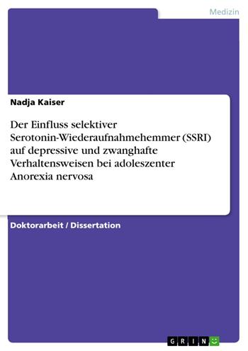 Doktorarbeit / Dissertation aus dem Jahr 2008 im Fachbereich Medizin - Therapie, Note: 2, Rheinisch-Westfälische Technische Hochschule Aachen, Sprache: Deutsch, Abstract: Die Anorexia nervosa ist eines der schwerwiegendsten Krankheitsbilder in der Kinder- und Jugendpsychiatrie. Die Behandlung ist oft langwierig, außerdem muss über Jahre hinweg mit einem hohen Rückfallrisiko gerechnet werden. Auch aufgrund der steigenden Inzidenz sowie der für eine psychiatrische Erkrankung relativ hohen Mortalität, besteht bei der Magersucht ein hoher Forschungsbedarf, insbesondere an Therapiestudien. Von Interesse ist dabei insbesondere die noch nicht geklärte Pathogenese der Anorexia nervosa. Es wird angenommen, dass unter anderem eine Vulnerabilität im serotoninergen Neurotransmittersystem ätiologisch relevant ist. Obwohl keine evidenz-basierte medikamentöse Standardtherapie in der Langzeitbehandlung der Anorexia nervosa existiert, wurden häufig selektive Serotonin-Wiederaufnahme-Hemmer (SSRI) angewandt, nicht zuletzt wegen der Effektivität dieser Medikamentengruppe bei Zwangs- und Depressionserkrankungen, die als komorbide Störungen bei Anorexia nervosa häufig zu beobachten sind. So wollten wir in dieser Arbeit untersuchen, inwiefern eine additive SSRI-Behandlung positive Auswirkungen auf den Verlauf der komorbiden Symptomatik bei jugendlichen Patienten mit Anorexia nervosa hat. [...]