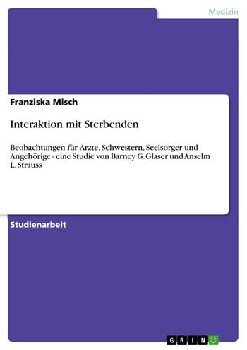 Studienarbeit aus dem Jahr 2006 im Fachbereich Pflegewissenschaft - Pflegemanagement, Note: 1,3, Alice-Salomon Hochschule Berlin , Veranstaltung: Qualitative Sozialforschung, Sprache: Deutsch, Abstract: Die Analyse der vorliegenden Studie von Glaser und Strauss (1964) beruht auf der genauen Beobachtung von Bewusstheits-Kontexten. Jene seien bei allen Beteiligten des Sterbeprozesses vorhanden. „Immer mehr Menschen werden im Krankenhaus und an chronischen Leiden sterben, und das Problem der Bewusstheit wird weiterhin an Bedeutung gewinnen.“ (Glaser & Strauss 1974, S. 14) Zudem sagten die Forscher voraus, dass durch die hartnäckigen Fragen der Todkranken und Sterbenden, die das Krankenhaus als wissenschaftliche Institution sehen und daher von dessen Stab ein kompetentes Urteil erwarten, das Bewusstseinsproblem zunehmend in den Mittelpunkt rücken wird. (Glaser & Strauss 1974, S. 14) Dieses Phänomen haben sich die Soziologen Glaser und Strauss zum Gegenstand ihrer Forschungsarbeit und Publikation gemacht. Glaser und Strauss erheben darüber hinaus den Anspruch, mittels ihrer Forschungsarbeit einen Beitrag zum besseren Verständnis sozialpsychologischer Aspekte der Sterbepflege zu leisten. (Glaser & Strauss 1974, S. 19) In der Folge möchte ich die einzelnen Beobachtungsschwerpunkte der Studie vorstellen. In der Publikation wurden diese mittels einzelner Kapitel getrennt. Ich beschränke mich dabei auf die zentralen Aussagen. [...]