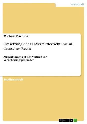 Studienarbeit aus dem Jahr 2007 im Fachbereich BWL - Recht, Note: 2,0, Gottfried Wilhelm Leibniz Universität Hannover, Sprache: Deutsch, Abstract: Die Umsetzung der EU-Vermittlerrichtlinie in Deutschland beschäftigte die Versicherungsbranche bereits seit einigen Jahren. Zusammen mit der anstehenden Reform des Gesetzes über den Versicherungsvertrag (VVG) zum 01.01.2008 sorgt sie für verschiedene Neuerungen auf dem Versicherungsmarkt. Diese Arbeit soll die zentralen Neuregelungen darstellen und die Änderungen für die Versicherungsvermittler und -berater aufzeigen. Weiterhin wird versucht – gestützt auf Expertenmeinungen – die Auswirkungen und zukünftigen Entwicklungschancen einzuschätzen.