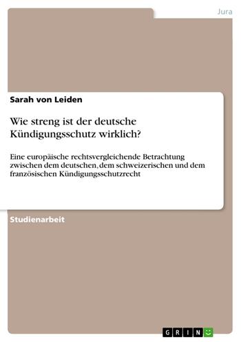 Studienarbeit aus dem Jahr 2007 im Fachbereich Jura - Andere Rechtssysteme, Rechtsvergleichung, Note: 1,3, Universität Hamburg, Veranstaltung: Internationales Arbeitsrecht I, Sprache: Deutsch, Abstract: Der deutsche Kündigungsschutz erhitzt die Gemüter. Ronald Pofalla etwa sieht darin eine unangemessene und kontraproduktive Regelungsdichte. Das Deutsche Institut der Wirtschaft hält die Schutzbestimmungen wenig nüchtern für „Arbeitsplatzkiller“ und auch der Münchner Allzweckgelehrte Hans-Werner Sinn hat natürlich eine Meinung dazu, wenn er feststellt, dass der deutsche Kündigungsschutz zwar keine Arbeitsplätze schütze, wohl aber die Arbeitslosigkeit vergrößere. Dem interessierten Zeitgenossen kann nicht entgangen sein, dass derartige Kritik auffallend oft aus unternehmensnahen und wirtschaftsliberalen Kreisen verlautet. Es drängt sich demnach die Frage auf – ist es für deutsche Unternehmer wirklich so viel komplizierter, ein Arbeitsverhältnis aufzulösen, als etwa für jene in den benachbarten Ländern Europas? Keine Frage, der Rahmen einer zehnseitigen Hausarbeit ist bei weitem zu eng, um diese Frage auch nur auf der rein normativen Ebene zu beantworten. Die vorliegende Arbeit beschränkt sich daher neben der kurzen Darstellung des deutschen Rechts auf einen bekanntermaßen liberalen Rechtskreis, die Schweiz. Frankreich, als ein Land, dem eine hohe Regelungsdichte zugeschrieben wird, beziehe ich ebenfalls mit ein. Über den Vergleich des „Law in the books“ hinaus müssen in jedem Fall historische und gesellschaftliche Zusammenhänge wenigstens skizziert werden. Es gilt auch, das „Law in Action“, also die praktische Umsetzung, in Augenschein zu nehmen. Das Ergebnis kann kein in die Tiefe gehender Vergleich sein, auch wird jeweils nur der Regelfall betrachtet, seien die Ausnahmen auch noch so interessant. Neben einer recht soliden Bestandsaufnahme des normativen Rechts wird die Arbeit auch einen Bezug zur eingangs genannten Fragestellung zu geben. Neben einer recht soliden Bestandsaufnahme des normativen Rechts wird die Arbeit auch einen Bezug zur eingangs genannten Fragestellung zu geben.