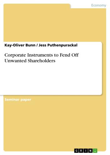Seminar paper from the year 2008 in the subject Business economics - Business Management, Corporate Governance, grade: 1,0, University of Applied Sciences Essen, course: International Management, language: English, abstract: As markets today mostly develop and change faster than companies can grow, the option of taking over other companies has become core to strategic management seeking to expand the company’s business and to create value for both customers and stakeholders. Hence M & A activities have significantly increased in today’s business world of fast changing global economies and emerging competition. This development forces prospective target companies to take action to protect themselves against hostile takeovers. In order to determine effective defence strategies and to apply appropriate anti-takeover instruments, many aspects such as motives and practical approach of the attacking company as well as a variety of legal frameworks and shareholder interests have to be reviewed diligently. This paper delivers a concentrated overview of the topic’s most important aspects and delineates some of the most common instruments to fend off unwanted shareholders. Particular attention is thereby payed to these instruments’ impact on stock prices of both the attacking and the target company. The authors hereunto present and interpret a significant amount of empirical evidence taken from real business cases where the previously discussed defence instruments were actually applied.