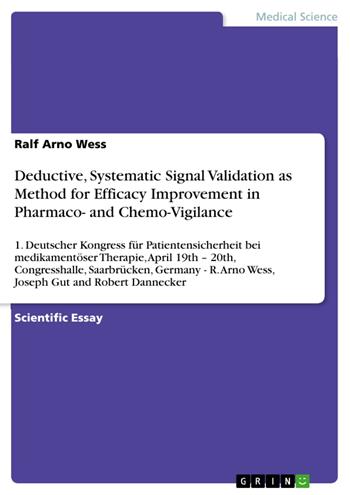 Scientific Essay from the year 2005 in the subject Pharmacology, grade: Keine, , course: 1. Deutscher Kongress für Patientensicherheit bei medikamentöser Therapie, Congresshalle, Saarbrücken, Germany, language: English, abstract: Signal Validation can lead Vigilance Just single ADRs relating the known benzene – toxicologic endpoints (leukemia, breast cancer) and these substances are worth to be investigated completely, since they enable risk assessments based on predisposition and epidemiology much earlier. The need of intelligence tools to deal with such heterogeneous data is obvious. The paradoxical situation that often arises is characterized by information overload but knowledge deficiency, and the need for intellectual involvement in information assimilation4. IT tools for intelligence are designed to assess risks in situations when only bits and pieces of knowledge are available but the situation forces to find the trace of future and past events (like it is the case in criminology, counter-terrorism, and military intelligence).