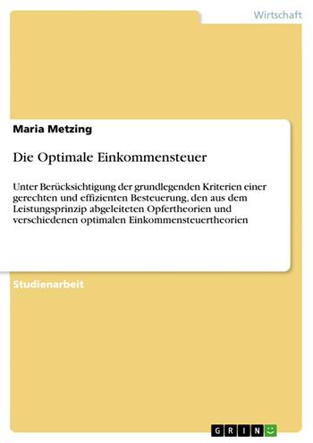 Studienarbeit aus dem Jahr 2008 im Fachbereich BWL - Wirtschaftspolitik, Note: 1,7, Humboldt-Universität zu Berlin (Finanzwissenschaft), Veranstaltung: Ökonomische Theorien der Gerechtigkeit, Sprache: Deutsch, Abstract: Das Ziel dieser Arbeit ist es zu zeigen, welche Faktoren bei der Konstruktion einer optimalen Einkommensteuer beachtet werden müssen und wie daraus eine optimale Einkommensteuerstruktur abgeleitet werden kann. Hierzu wird im zweiten Kapitel auf die grundlegenden Kriterien einer gerechten und effizienten Besteuerung eingegangen. Das dritte Kapitel beschäftigt sich mit den aus dem Leistungsprinzip abgeleiteten Opfertheorien und das Vierte mit verschiedenen optimalen Einkommensteuertheorien in Anlehnung an Mirrlees und Sheshinski. Die Schlussbemerkung beinhaltet eine kurze Zusammenfassung und beschäftigt sich kurz mit einigen Kritikpunkten.