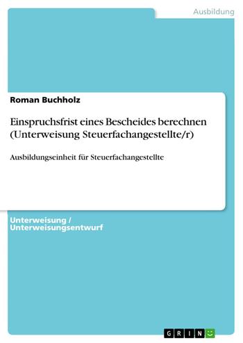 Unterweisung / Unterweisungsentwurf aus dem Jahr 2009 im Fachbereich AdA Kaufmännische Berufe / Verwaltung, Note: keine, , Sprache: Deutsch, Abstract: Das Unterweisungsthema „Einspruchsfrist eines Bescheides berechnen“ ist lt. Verordnung über die Berufsausbildung zum Steuerfachangestellten / zur Steuerfachangestellten vom 09. Mai 1996 in § 3 Nr. 6.1 Buchstabe e) dem Punkt „Abgabenordung – Fristen und Termine berechnen“ zuzuordnen. Der Auszubildende durchläuft die dreijährige Ausbildung zum/zur Steuerfachangestellten. Unter § 3 Nr. 6.1e) der Verordnung über die Berufsausbildung zum/zur Steuerfachangestellten sollen Kenntnisse und Fertigkeiten über die Abgabenordnung im Allgemeinen und über die Berechnung von Fristen und Terminen im Speziellen vermittelt werden. In der zeitlichen Gliederung des Ausbildungsrahmenplans ist unter anderem diese Ausbildungseinheit im ersten Ausbildungsjahr mit einer Dauer von vier bis sechs Monaten vorgesehen.