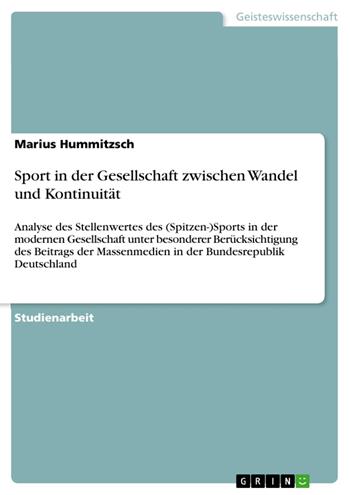 Studienarbeit aus dem Jahr 2009 im Fachbereich Soziologie - Individuum, Gruppe, Gesellschaft, Note: 1,0, Justus-Liebig-Universität Gießen, Veranstaltung: Sozialer Wandel – Zur Sozialstruktur moderner Gesellschaften, Sprache: Deutsch, Abstract: „Mit den gesellschaftlichen Veränderungsprozessen und ihren Auswirkungen auf den Sport entwickelt sich dieser zu einem immer wichtiger und einflussreicher werdenden Kultur- und Sozialphänomen.“ Diese Aussage, die einige wesentliche Aspekte der folgenden Arbeit aufgreift, trifft Otmar Weiß in seinem Werk „Einführung in die Sportsoziologie“. So möchte ich mich unter anderem mit der Frage auseinandersetzen, welche Bedeutung dem Sport als sozialem Feld, wobei ich eine notwendige Ausdifferenzierung von Leistungs- und Breitensport vornehmen werde, in der modernen Gesellschaft, explizit in der Bundesrepublik Deutschland, zukommt und inwieweit hier eine Veränderung im 20.Jahrhundert bzw. 21.Jahrhundert stattgefunden hat. Zählt der Sport bzw. besser gesagt gehören die handelnden Akteure im Sport wirklich zu den Profiteuren aus dem Wandel hin zu einer postmodernen Werteorientierung? Verändert die Gesellschaft den Sport oder der Sport die Gesellschaft? Diese Fragen stellen ganz zentrale Elemente des ersten Teils dieser Arbeit dar. Im weiteren Verlauf werde ich einen Schwerpunkt auf die Untersuchung des Einflusses der Medien auf die Rezeption, den Konsum und letztlich den kulturstiftenden Beitrag des Sports in der Gesellschaft legen, wobei die Betrachtungen primär für den Leistungssport Gültigkeitsanspruch besitzen werden. Welcher Wandel lässt sich durch die rasante Verbreitung der Massenmedien im Spannungsgefüge Sport-Gesellschaft-Medien beobachten? Schließlich folgt eine Episode, in der es sich ganz speziell um die handelnden Akteure im Feld des Sports drehen wird. Hier möchte ich allerdings nur einzelne Punkte wie das Geschlechterverhältnis und die Schichtenabhängigkeit im Sport knapp beleuchten und dabei lediglich ganz wesentliche Schlüsse vorstellen. Natürlich wird der Fokus auch auf der Frage nach Veränderung oder Kontinuität liegen. Alles in allem ist es das Ziel der Arbeit, in einer ansprechenden Art und Weise die Faktoren im sozialen Feld Sport, die einem Wandel unterworfen oder durch eine Kontinuität charakterisiert sind, zu prüfen und dabei immer wieder den wechselseitigen Einfluss von Sport, Gesellschaft und Medien aufzugreifen. Die eingangs zitierte Formulierung von Otmar Weiß, dass der Sport gerade bedingt durch den gesellschaftlichen Wandel einen absoluten Bedeutungszuwachs erfährt, bildet somit eine absolute Leitthese dieser Arbeit, die zur Disposition gestellt und nur durch die Schwerpunktsetzung der Medienrelevanz erweitert wird.