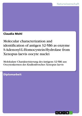 Diplomarbeit aus dem Jahr 1996 im Fachbereich Biologie - Genetik / Gentechnologie, Note: keine Angabe, Eberhard-Karls-Universität Tübingen (Max-Planck-Institut für Entwicklungsbiologie, Tübingen), Veranstaltung: -, Sprache: Deutsch, Abstract: Molecular characterization and identification of antigen 32-5B6 as enzyme S-Adenosyl-L-Homocystein-Hydrolase from Xenopus laevis oocyte nuclei Claudia Mohl Diploma thesis in Biochemistry, Eberhard-Karls-University, Tübingen, 1996 and Max-Planck-Institut for Development Biology, Tübingen (Title and Abstract in english; Original work in german) Abstract: The aim of my diploma thesis work (1996) was molecular characterization and identification of late migrating antigen 32-5B6 on a molecular level. Antigen 32-5B6 is a protein that is distributed in cytoplasm during Blastula stage and transported into oocyte cell nuclei at Gastrula stage 12 during embryonic development of Xenopus laevis (Dreyer et al. 1982; 1983). To isolate cDNA sequences that encode the late migrating antigen 32-5B6, I screened, isolated and sequenced five cDNA clones from placques with positive antibody reaction from a Xenopus laevis ovar lambda zap II cDNA expression library. Sequence analysis showed that two cDNA clones encode the enzyme S-Adenosyl-Homocystein-L-Hydrolase (clone 10) from Xenopus laevis (Seery et al. 1994) and an isoform of this enzyme (clone 8). Molecular weight and IEP of S-Adenosyl-Homocystein-L-Hydrolase are nearly identical with those of antigen 32-5B6. To get further evidence in regard to sequence of antigen 32-5B6, proteins were isolated from original Xenopus laevis oocyte nuclei for protein microsequencing. For this reason I established a new protein purification strategy purifying proteins from original oocyte nuclei of Xenopus laevis proteom by means of anion-exchange chromatography and 2-dimensional gel electrophoresis. By means of western blot analysis I could detect two enzyme isoforms those IEPs lie in range between pH 6.02 - 6. 2 and with molecular weights between 46 and 47.7 kDa. Protein microsequencing were performed by Prof. Dr. Klaus Weber and Uwe Plessmann (MPI for Biophysical Chemistry, Göttingen, Germany) and confirmed result of screening of Xenopus laevis ovar lambda zap II cDNA expression library. Eight peptides of different lenght were to 100% identical with protein sequences of enzyme S-Adenosyl-L-Homocystein-Hydrolase from Xenopus laevis (Seery et al. 1994) and peptides derived from cDNA sequences of clone 8 and 10. Following the antigen 32-5B6 is identical with the enzyme S-Adenosyl-Homocystein-L-Hydrolase from Xenopus laevis (Seery et al. 1994) and a new isoform of this enzyme could be identified during this diploma thesis.