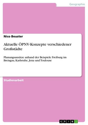 Studienarbeit aus dem Jahr 2002 im Fachbereich Geowissenschaften / Geographie - Bevölkerungsgeographie, Stadt- u. Raumplanung, Note: 1,0, Humboldt-Universität zu Berlin (Geographisches Institut), Veranstaltung: Planungsprobleme der Verkehrs- und Siedlungsentwicklung, Sprache: Deutsch, Abstract: In dieser Hausarbeit werden die Nahverkehrskonzepte von vier Großstädten in Deutschland und Frankreich vorgestellt, die auf jeweils verschiedene Schwerpunkte setzen. Allerdings lässt sich hier der schienengebundene Verkehr aufgrund der Stadtgrößen schwer ausklammern. Freiburg im Breisgau, als Deutschlands Vorzeigestadt in Sachen erfolgreicher ÖPNV, setzt auf einen kontinuierlichen Ausbau der Stadtbahn und ein attraktives und unkompliziertes Tarifsystem. Das südfranzösische Toulouse verlagerte den ÖPNV schwerpunktmäßig in den Untergrund. Karlsruhe setzt auf den Verbund und Jena verdoppelte nach der politischen Wende sein Straßenbahnnetz.