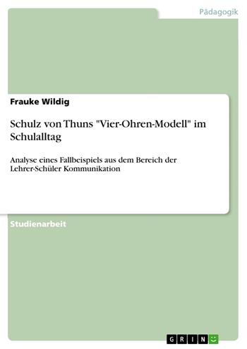 Studienarbeit aus dem Jahr 2009 im Fachbereich Pädagogik - Schulpädagogik, , Sprache: Deutsch, Abstract: Die vorliegende Arbeit beschäftigt sich mit dem „Vier-Ohren-Modell“ von Schulz von Thun und der Anwendbarkeit des Modells im Bereich der Schule. Zunächst wird das Modell von Schulz von Thun erläutert. In einem weiteren Kapitel sollen dann anhand eines Fallbeispiels aus dem Bereich der Lehrer-Schüler-Kommunikation mithilfe der Theorie von Friedemann Schulz von Thun Kommunikationsstörungen bewusst gemacht werden und Verbesserungsvorschläge diskutiert werden. In diesem Zusammenhang soll die Frage beantwortet werden, inwiefern sich Kommunikationsprobleme an Schulen, durch die es zu einer Behinderung in der Wissens- und Kompetenzvermittlung kommt, mithilfe des Kommunikationsmodells von Schulz von Thun vermieden werden können. In diesem Kontext soll ebenfalls diskutiert werden, ob dieses Modell ausreichend für die Analyse von Kommunikationssituationen im Schulalltag ist. An dieser Stelle soll noch darauf hingewiesen werden, dass es in der Kommunikationswissenschaft natürlich verschiedene Modelle gibt, um Sprachfunktionen zu beschreiben. Ich setze mich in dieser Arbeit mit dem „Vier-Ohren-Modell“ von Schulz von Thun auseinander. Das Modell zeigt eine klare Parallele zu Paul Watzlawicks Modell vor allen Dingen im Hinblick auf Watzlawicks Regel „Jede Kommunikation hat einen Inhalts- und einen Beziehungsaspekt.“ Eine weitere Gemeinsamkeit zwischen den beiden Modellen liegt auch darin, dass sowohl Watzlawick als auch Schulz von Thun davon ausgehen, dass jede Äußerung mehrere Botschaften enthält, d. h. verschiedene kommunikative Funktionen hat. Darüber hinaus verarbeitet Schulz von Thun in seinem Vier-Ohren-Modell auch die drei Seiten des „Organon-Modells“ von Karl Bühler, nämlich dass jede Information etwas über die Sache, über den Sender und einen Appell an den Empfänger enthält.