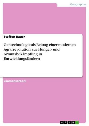 Examensarbeit aus dem Jahr 2010 im Fachbereich Geowissenschaften / Geographie - Wirtschaftsgeographie, Note: 1,3, Friedrich-Alexander-Universität Erlangen-Nürnberg (Geographie ), Sprache: Deutsch, Abstract: Nach der Grünen Revolution steht die Welt erneut vor einer Erneuerung der Landwirtschaft: der gentechnischen oder auch gelben Revolution. Auf sie werden große Hoffnungen gesetzt und Befürworter versprechen, dass es durch die Gentechnik möglich sein wird, nachhaltig und ökologisch zu produzieren, eine wachsende Weltbevölkerung zu ernähren, sowie Armut und Hunger weltweit zu bekämpfen. Die Kritiker der Gentechnik sehen dagegen eine ökologische und gesundheitliche Katastrophe auf die Menschheit zukommen. Unabhängig von beiden Meinungen zeigen Statistiken, dass gentechnisch veränderte Pflanzen in einigen Ländern der Erde auf dem Vormarsch sind, während andere Länder sich weigern eine Zulassung für den Anbau von gentechnisch veränderten Pflanzen zu erlassen. Die Fronten zwischen Gentechnik Befürwortern und Gegnern sind verhärtet. Die vorliegende Arbeit wird sich vor allem auf die Situation in Entwicklungsländern beziehen und soll dazu beitragen, die Diskussion um die Gentechnik als Hilfe zur Armuts- und Hungerbekämpfung sowie das Für und Wider einer Anwendung in der Landwirtschaft, sachlich zu betrachten. Um die aktuelle Situation zu verstehen, ist es nötig einen Blick in die Vergangenheit zu werfen und das Vorgehen, sowie das Ausmaß der Grünen Revolution in Entwicklungsländern zu untersuchen. Es wird versucht, etwaige Parallelen zwischen der Grünen und der Gelben Revolution zu ziehen. In einer sachlichen Sichtweise sollen die Argumente der Befürworter sowie der Kritiker der Gentechnik dargestellt und analysiert werden. Eine Betrachtung der aktuellen Situation bezüglich Anbau und Akzeptanz von Gentechnik in Entwicklungsländern soll zeigen, in wie weit diese neue Art der Pflanzenzucht bereits zur Realität geworden ist. Natürlich ist es nicht möglich in dieser Arbeit eine gesamte Bestandsaufname darzustellen. Vielmehr wird versucht, durch Betrachtung und Analyse einzelner Ausschnitte, einen Einblick in die Diskussion und ihre Auswirkungen bezüglich der Gentechnik zur Armuts- und Hungerbekämpfung in Entwicklungsländern zu ermöglichen. Abschließend soll keine Empfehlung dargebracht werden, sondern eine sachliche Betrachtung von Vor- und Nachteilen dazu beitragen, die aktuellen Vorgänge und Diskussionen zu verstehen.