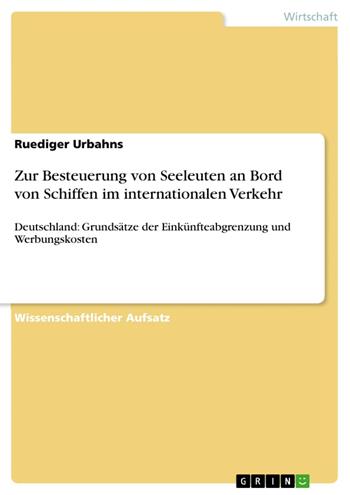 Wissenschaftlicher Aufsatz aus dem Jahr 2010 im Fachbereich BWL - Rechnungswesen, Bilanzierung, Steuern, , Sprache: Deutsch, Abstract: In Deutschland unterliegt die Besteuerung von Seeleuten an Bord von Schiffen im internationalen Verkehr einigen Besonderheiten. Zum einen betrifft dies die Frage ob Seeleute – insbesondere beschränkt steuerpflichtige Seeleute – überhaupt in Deutschland mit ihrer Heuer (anteilig) steuerpflichtig sind. Zum anderen betrifft dies die ggf. als Werbungskosten absetzbaren Reisekosten, insbesondere Verpflegungsmehraufwendungen, von Seeleuten. Hier haben sich seit 2005 zum Teil erhebliche Änderungen ergeben. Die Grundsätze hierzu werden nachfolgendend unter Beachtung aktueller Rechtsprechung und Literatur kurz und prägnant anhand zahlreicher Beispiele dargestellt. The taxation of ship crews on board of ships in international traffic is subject to specific requirements in Germany. On the one hand this concerns the question whether sailors - in particular ship crews without tax residency in Germany – are taxable with their salary in Germany. On the other hand this concerns the question which expenses are deductible from such income if taxable in Germany. This script provides practical insight in German language on the basis of numerous examples. Information in English languages can be provided by the author on request.