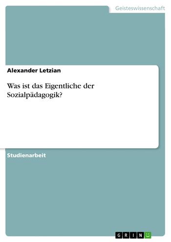 Studienarbeit aus dem Jahr 2010 im Fachbereich Soziale Arbeit / Sozialarbeit, Note: 1,7, Evangelische Hochschule für Soziale Arbeit Dresden (FH), Veranstaltung: MAS 1: Spezifische Sozialarbeitstheorien I, Sprache: Deutsch, Abstract: Hintergrund des Themas: Der Hintergrund des Themas ist, dass ich mir im Zuge der Diskussionen um (die Wissenschaft der) Soziale(n) Arbeit und Sozialpädagogik die Frage gestellt habe, was das pädagogische Moment in der Sozialpädagogik bzw. in der Sozialen Arbeit ausmacht und wie durch Pädagogik den verschiedenen sozialen Problemen begegnet, diesen vorgebeugt werden kann bzw. diese gelöst werden. Dabei kam ich an den Punkt zu fragen, was denn genau die Sozialpädagogik ausmacht, vereint sie doch in ihrer Bezeichnung beides – das Soziale und die Pädagogik. Nun scheint die Frage nach dem Eigentlichen der Sozialpädagogik auf dem ersten Blick etwas verwirrend zu sein, suggeriert sie doch, dass in der Sozialpädagogik ein Bedarf besteht, die Identität der Sozialpädagogik zu klären und zudem suggeriert das Thema der Arbeit, dass so etwas wie eine ureigenste Besonderheit der Sozialpädagogik existiert, welche in keinem anderen Feld anzutreffen ist. Ziel der Arbeit: Vordergründiges Ziel der Arbeit ist es, für mich eine Klärung der Frage zu finden. Ich hoffe durch die vorliegende Arbeit aber auch, das Bewusstsein für einen zweiten Blick auf die Frage nach dem Eigentlichen der Sozialpädagogik zu wecken. Um im Sinne von Hans Thiersch zu sprechen: Was bedeutet es für die Praxis, wenn wir einen speziellen Arbeitsbereich annehmen, der sich dadurch auszeichnet, dass er „Soziales“ und „Pädagogik“ miteinander in Verbindung bringt?