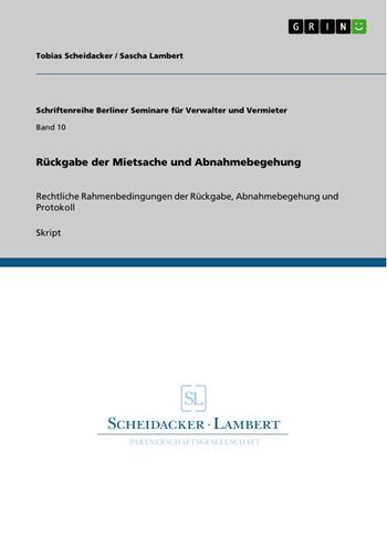 Skript aus dem Jahr 2011 im Fachbereich Jura - Zivilrecht / BGB AT / Schuldrecht / Sachenrecht, , Veranstaltung: Berliner Seminare für Verwalter und Vermieter, Sprache: Deutsch, Abstract: Aus Verwalterperspektive werden sämtliche Aspekte des Rückerhalts von Mietobjekten beleuchtet: welche Rechtsvorschriften gibt es, welche Fristen gelten, Teilräumung, Rückgabezeitpunkt, Abnahmebegehung, Protokoll, Rückgabe an Dritte oder durch Dritte, Mietermehrheit, Verjährung usw. Ziel ist, daß der Sachbearbeiter in der Immobilienverwaltung oder der selbstverwaltende Eigentümer einen Leitfaden erhält, der ihm in jeder entsprechenden Situation beisteht. Das Skript war Grundlage mehrerer Verwalterseminare zu diesem Thema. Die Ergebnisse der Erörterungen auf den Veranstaltungen, die aufgetretenen Praxisfragen etc. haben darin Eingang gefunden.