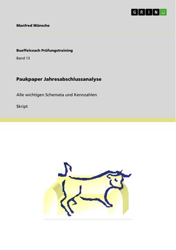 Skript aus dem Jahr 2011 im Fachbereich BWL - Rechnungswesen, Bilanzierung, Steuern, , Veranstaltung: -, Sprache: Deutsch, Abstract: Für die Aufbereitung von Zahlenmaterial für eine Bilanzanalyse gibt es viele verschiedene Schemata zur Strukturbilanz, Kapitalflussrechnung und Erfolgsspaltung. Hier sind alle wichtigen Varianten zum Lernen und Trainieren zusammengefasst. Dazu gibt es noch eine lange Liste von Kennzahlen, die in Prüfungen gefragt werden. Geschäftsbericht nehmen, Schemata danebenlegen, und los geht das Prüfungstraining.