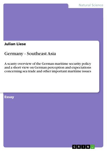 Essay from the year 2009 in the subject Nautical Science, grade: 2,0, Nanyang Technological University (Institute of Defence and Strategic Studies), language: English, abstract: This comment shall give an insight into the German perception with regard to its own maritime interests in the Southeast Asian area. First, the objectives of the government will be lighted up. Secondly, military, as well as economic aspects of the maritime domain in Southeast Asia will be discussed. The main focus will lie on the area of the energy production industry, the container transport and India as an ambitious maritime power.