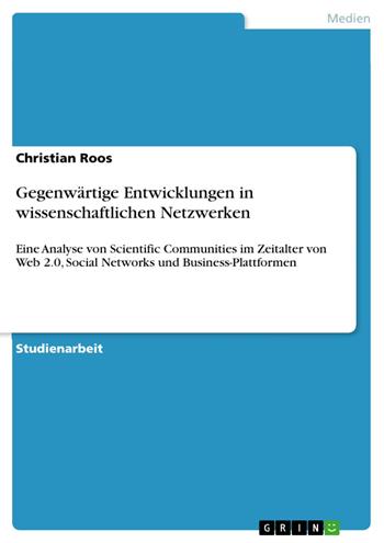 Studienarbeit aus dem Jahr 2011 im Fachbereich Medien / Kommunikation - Medien und Politik, Pol. Kommunikation, Note: 1,0, Universität Leipzig (Institut für Kommunikations- und Medienwissenschaft), Veranstaltung: Politik und Ökonomie der Kommunikation, Sprache: Deutsch, Abstract: „Seit einigen Jahren verändert sich das Internet immer auffälliger. Die Medien berichten über Communities, Plattformen und Netzwerke, in denen Nutzer meist ohne kommerzielle Anreize und Motive selbst Inhalte publizieren.“ Diese Entwicklung ist keinesfalls abzustreiten. Dennoch wirft sich in diesem Zusammenhang die Frage auf, ob Communities, Plattformen und Netzwerke im Zeitalter des Web 2.0 einen echten wissenschaftlichen Nutzwert besitzen oder ob von einer schlichten Ansammlung ungeprüften Wissens ausgegangen werden muss, an der sich beinahe jeder Internet-User beteiligen kann. Im Folgenden soll analysiert werden, inwiefern der wissenschaftliche Austausch von diesen medialen Erscheinungen des Webs 2.0 profitieren kann. Allerdings wird auch kritisch zu betrachten sein, welche Risiken die gegenwärtigen Entwicklungen für wissenschaftliche Netzwerke bergen. Doch der Schwerpunkt dieser Arbeit soll nicht allein auf dem Austausch von wissenschaftlicher Forschung beispielsweise in der Chemie oder Physik beruhen. Vielmehr wird auch zu analysieren sein, inwiefern Betriebe wie z. B. Wissenschaftsverlage, ihre ökonomischen Ambitionen innerhalb des Wettbewerbes durch die Möglichkeiten des Webs 2.0 geltend machen können. Zunächst soll ein Definitionsansatz der Scientific Communities geboten werden, an die sich eine prägnante Charakteristik anschließt. Es gilt, diese Scientific Communities speziell in Zeiten der Online-Kommunikation zu analysieren. In diesem Kontext soll untersucht werden, ob ohne das Medium Web 2.0 ein Austausch innovativer wissenschaftlicher Erkenntnisse in der gegenwärtigen Entwicklung möglich wäre. Einen weiteren Schwerpunkt wird die wissenschaftliche Betrachtung von Online-Communities einnehmen. In diesem Kontext sollen u. a. On- und Offline Communities gegenübergestellt, deren Bildung und Charakteristik beleuchtet werden. Weiterhin wird herauszustellen sein, ob die Verwendung von Online-Netzwerken für Scientific Communities zu befürworten oder abzulehnen ist. Insbesondere soll exemplarisch die Business-Plattform xing.com hinsichtlich ihres ökonomischen Nutzwertes für Betriebe untersucht werden. Interessant erscheint es in diesem Zusammenhang, einen Blick auf entscheidende Aspekte beim Aufbau eines eigenen Netzwerkes zu werfen. Des Weiteren wird der wissenschaftliche Austausch mithilfe sozialer Netzwerke kritisch zu hinterfragen sein. Auch eine Beurteilung aus ökonomischer Perspektive hinsichtlich des Innovativwertes wird sich anschließen.