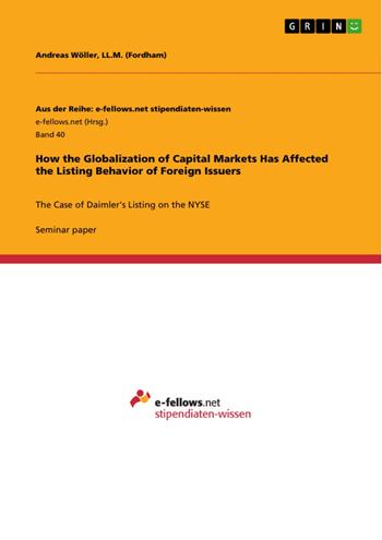 Seminar paper from the year 2011 in the subject Economics - Foreign Trade Theory, Trade Policy, grade: Honors, Fordham University School of Law, language: English, abstract: This case study on Daimler’s history on the NYSE aims to illustrate how global equity markets have evolved in the past two decades and what the reasons are for companies to raise capital in these global markets. In doing so, the case study proceeds as follows: After a brief introduction in Part I, Part II describes the initial listing of Daimler ADRs on the NYSE in October 1993 and its consequences for Daimler’s financial reporting, followed by the reasons that motivated Daimler to come to New York. Part III provides an overview of the legislative and regulatory changes that took place both in Germany and the U.S., and how these developments affected Daimler’s decision to terminate its listing on the NYSE in 2010. Part IV investigates how investors today are able to invest in foreign issuers such as Daimler. Finally, the case study concludes by summarizing the reasons for Daimler’s delisting and its meaning for the competitiveness of the U.S. public markets in Part V.