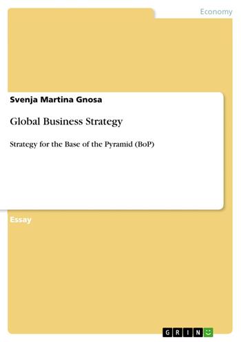 Essay from the year 2011 in the subject Business economics - General, grade: 1,0, , course: Global Business Strategy, language: English, abstract: This paper will first outline what the more attractive industries for the base of the pyramid, in order to alleviate their poverty, are. In the next section aspects, which might determine the performance of a corporation in the emerging economies will be examined from a resource-based point of view. Moreover crucial differences in formal and informal rules between developed and emerging economies from an institutionbased point of view will be illustrated. Finally the argument that aggressively investing in emerging economies is not only economically beneficial but also highly ethical in contradiction to rushing in emerging markets is reckless, will be discussed in depth.