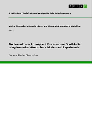 Doctoral Thesis / Dissertation from the year 2008 in the subject Physics - Astronomy, University of Kerala (Space Physics Laboratory, Vikram Sarabhai Space Centre - Indian Space Research Organization, Dept. of Space, Govt. of INdia), course: Physics - Atmospheric Sciences, language: English, abstract: Troposphere is the lowest layer of the atmosphere, where the temperature decreases with increasing altitude. The prime objective of this study is the characterization of various atmospheric processes ranging from a few kilometers to a few hundreds of kilometers taking place within this layer over the southern part of Indian sub-continent with the aid of numerical atmospheric models and observational data. With a view to broadening our understanding on some of the interesting atmospheric events such as Sea/Land Breeze Circulation (SLBC), Mountain Waves, and Thunderstorms, hitherto not attempted very much in an analytical and quantitative sense by many researchers the world over, the contents of this thesis titled “Studies on Lower Atmospheric Processes over South India using Numerical Atmospheric Models and Experiments” are organized into seven chapters.